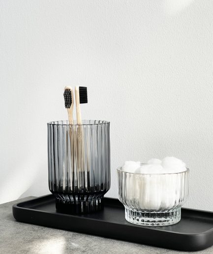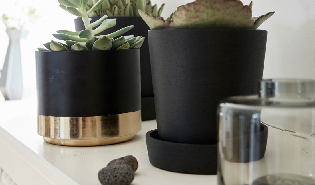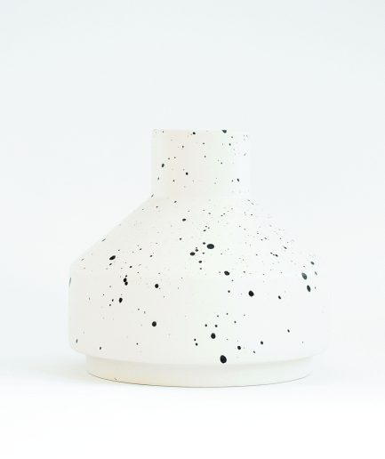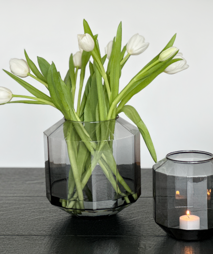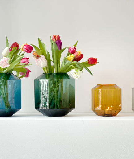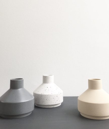 אגרטלי זכוכית, מתכת, וקרמיקה בעיצוב נקי עם צורניות גרפית חזקה.