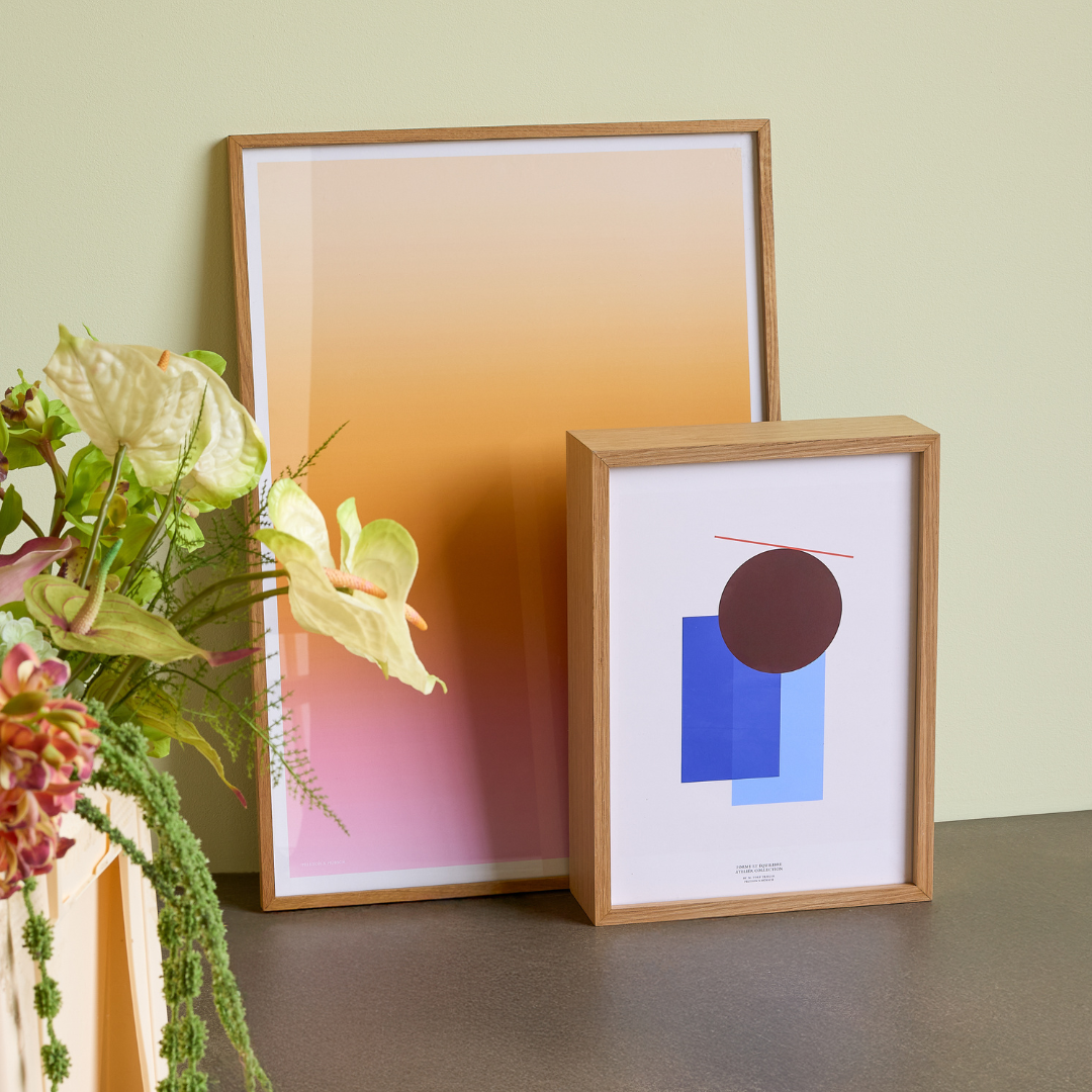 פרינטים נבחרים של Peleton Art – סטודיו לאמנות עכשווית בקופנהגן – משולבים במסגרת עץ טבעי של Hübsch.